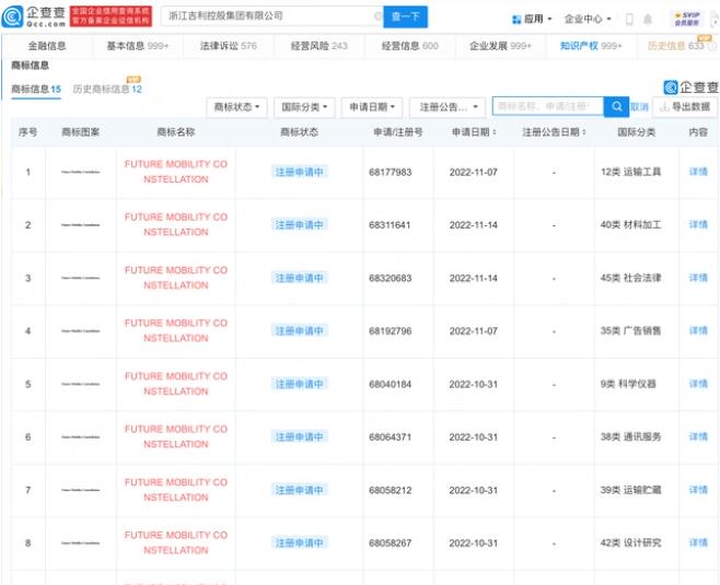 企查查APP顯示,近日,浙江吉利控股集團有限公司申請注冊多枚“FUTURE MOBILITY CONSTELLATION”商標,國際分類涉及社會法律、運輸工具等,當前商標狀態多為注冊申請中。