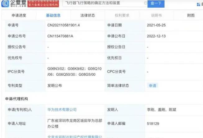 企查查APP顯示,近日,華為技術(shù)有限公司“飛行器飛行策略的確定方法和裝置”專利公布。