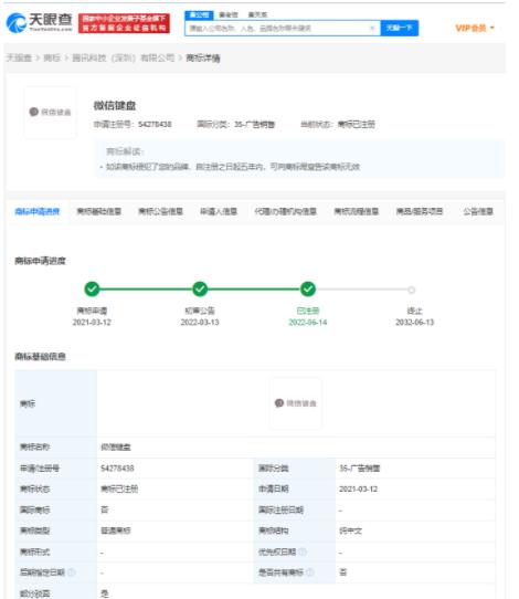 天眼查App顯示,騰訊科技(深圳)有限公司曾多次申請“微信鍵盤”商標,其中去年3月申請的多枚商標已成功注冊,今年3月再次申請的多枚商標狀態為“駁回復審中”。此外,騰訊公司還于近日申請注冊多個“微信輸入法”圖形商標,國際分類涉及科學儀器、教育娛樂、通訊服務等,當前商標狀態均為等待實質審查。